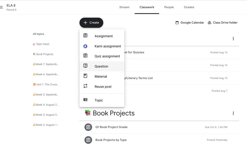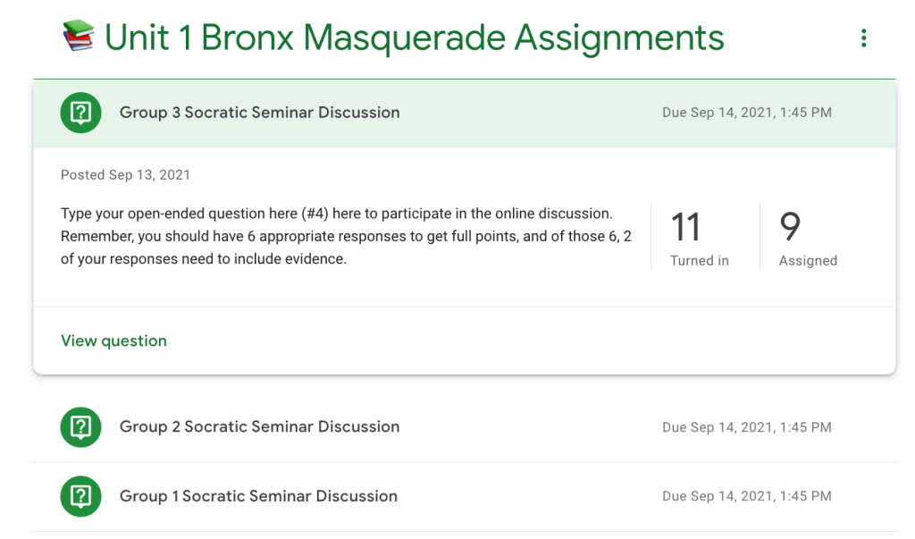 You will have to decide how to set up the online discussion piece of the hybrid Socratic seminar. I use the Google question “question” feature in Google classroom.