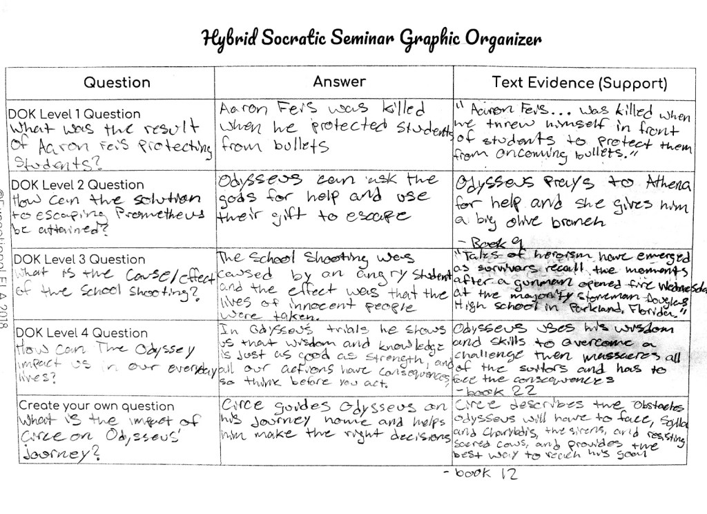 It’s best if you center your hybrid Socratic seminar around a theme. This helps focus the discussion and students can generate more specific questions. For example, for one of the hybrid Socratic seminars we did in my 8th grade ELA classroom, we read “The Odyssey” and a nonfiction article on modern day heroes. It was used at the end of the unit as a summative assessment. The overall theme for our seminar was “What makes a hero?”