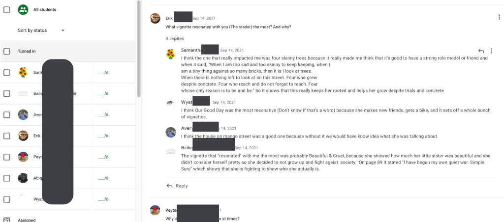 Here’s what a sample Google classroom conversation looks like after a hybrid Socratic seminar.