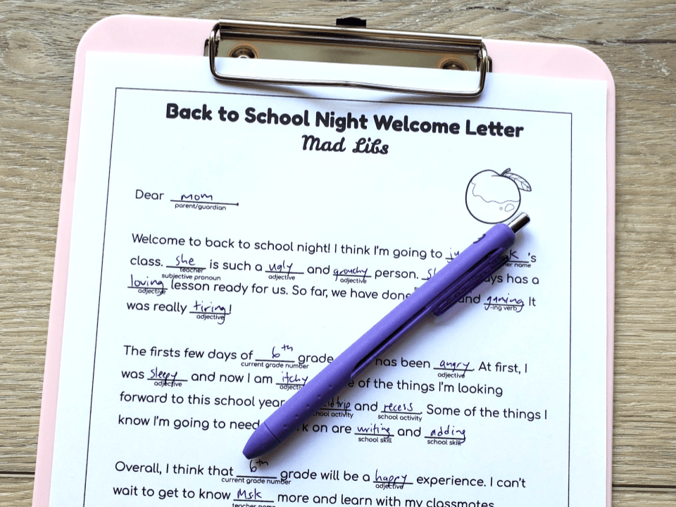 If you have a few days with students BEFORE back to school night, a fun activity to have them do is a back to school night welcome letter mad libs. It’s good for a laugh if you leave it on each student’s desk for parents to discover when they walk into your classroom for back to school night.