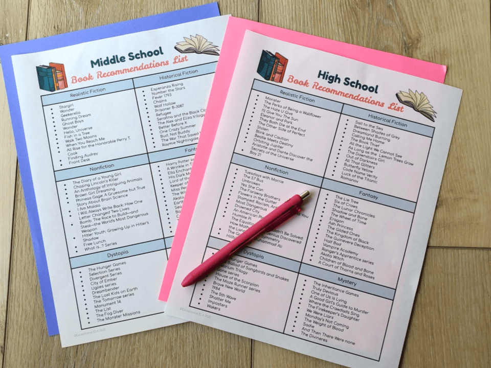 - Recommended reading book list: For ELA specifically, one question I get all the time is: How do I get my kid to read?? This handy dandy list of recommended books for middle and high school students in included in this resource. Books are separated by genre, so it’s easy to find books that are within students’ interest.