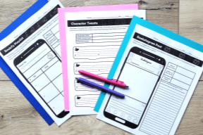 How it works: Students roll a die to get ideas for a random setting, protagonist, conflict, antagonist, adjectives, and more. (Pro-tip: Use this link for digital dice so that the dice aren’t rolling all over the place causing a ruckus!) Then, they put it all together in a unique story! I usually have students type their stories out and bold the places where the ideas generated from the mats appear. If we have time, it’s really fun to let students share these out loud!